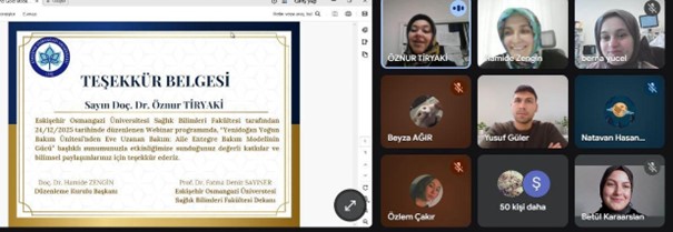 Sağlık Bilimleri Fakültesi Dekanlığı ile Hemşirelik Bölümü Çocuk Sağlığı ve Hastalıkları Hemşireliği Anabilim Dalı öğretim üyesi Doç. Dr. Hamide Zengin, Hemşirelik Yüksek Lisans öğrencisi Berna Yücel ve Hemşirelik 4. sınıf öğrencileri Yusuf Güler ile Betül Karaarslan’ın katkılarıyla düzenlenen “Yenidoğan Yoğun Bakım Ünitesi’nden Eve Uzanan Bakım: Aile Entegre Bakım Modelinin Gücü” başlıklı webinar, 24 Aralık 2025 tarihinde Google Meet platformu üzerinden gerçekleştirildi.
